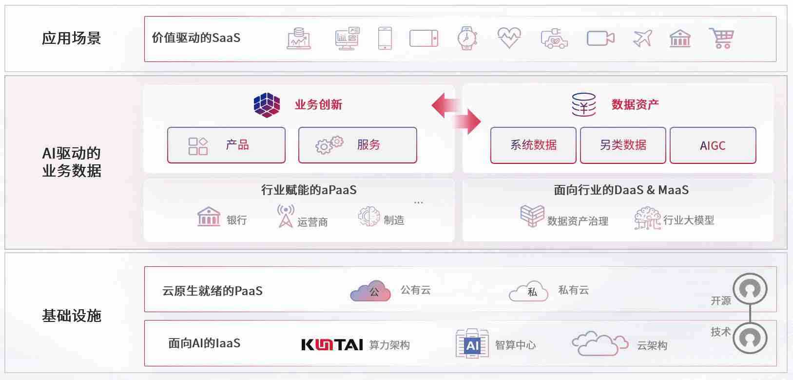 数字时代,,,围绕企业数字化转型的关键要素,,KD钱包数码开创性的提出数云融合战略和技术体系框架,,,着力在云原生、、数字原生、、AI原生和信创产业上架构产品和服务能力,,,为处在不同数字化转型阶段的快消零售、、汽车、、金融、、医疗、、、、政企、、、、教育、、运营商等行业客户提供泛在的敏捷IT能力和融合的数据驱动能力,,,,构建跨界融合创新的数字业务场景和新业务模式,,助力企业级客户建立面向未来的核心能力和竞争优势,,,,全面推动社会的数字化、、智能化转型升级。。