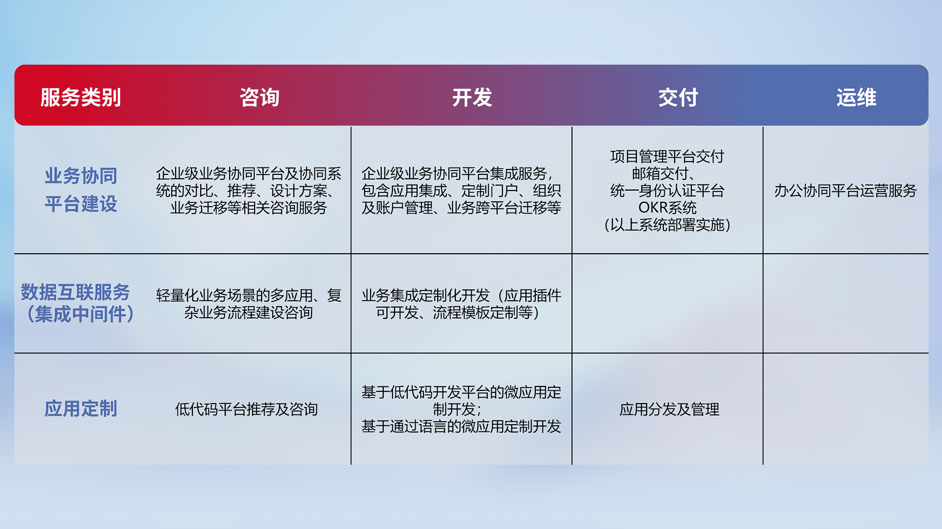 针对钉钉、、、、企微、、、、IDaas等平台级产品提供产品的规划、、、方案、、、、交付、、、、定制化开发等服务,,,,实现如统一协同办公、、智能客户服务、、、、混合会议管理、、、、智能数据查询、、等业务场景,,,实现数字化转型。。。。